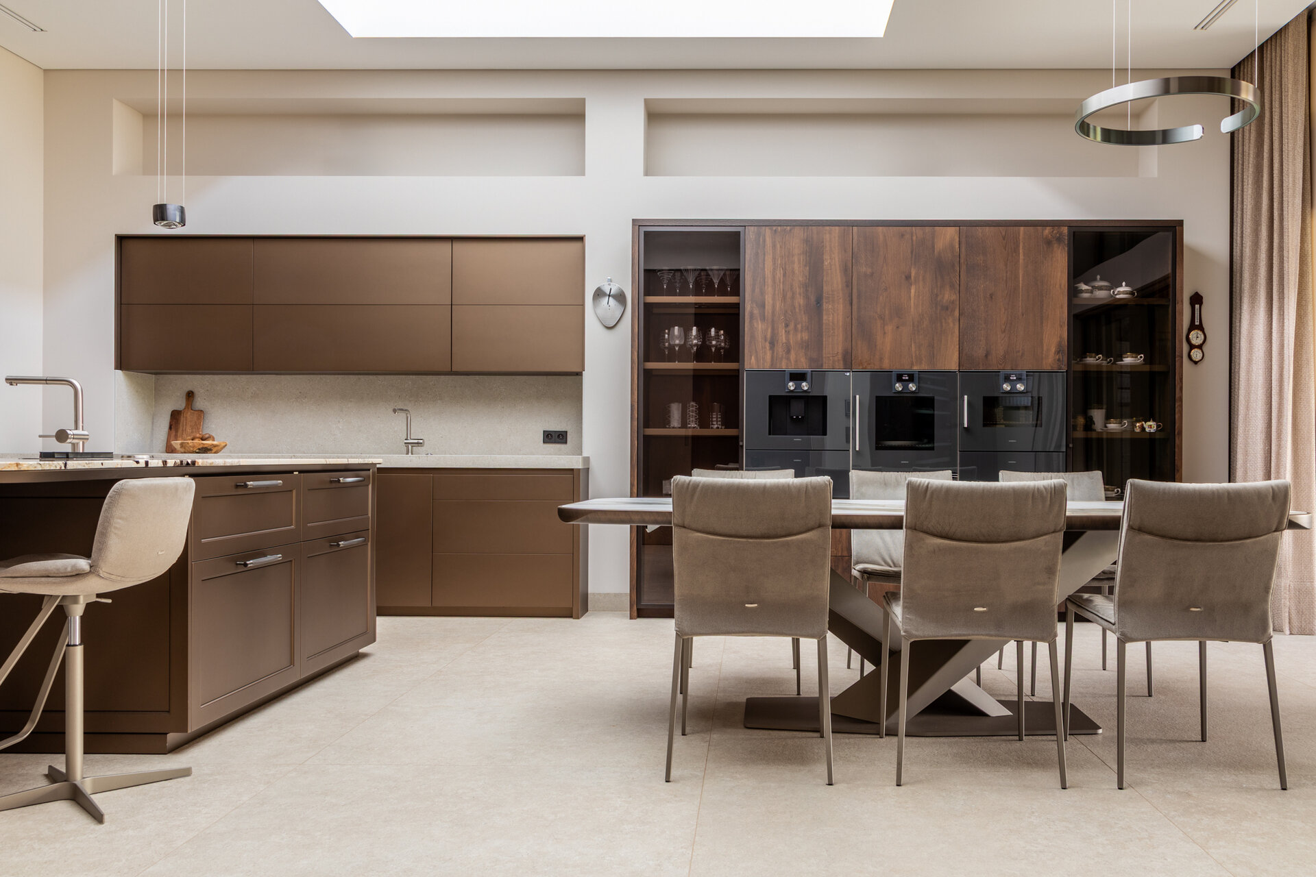 Gładka, chłodna w dotyku bryła reaguje na każdy ruch, subtelnie rozświetlając przestrzeń i nadając jej niemal biżuteryjny charakter. To rzemieślnicza precyzja ernestrust, która zamienia zwykłą kuchnię w zmysłowe doświadczenie blasku i tekstury.
