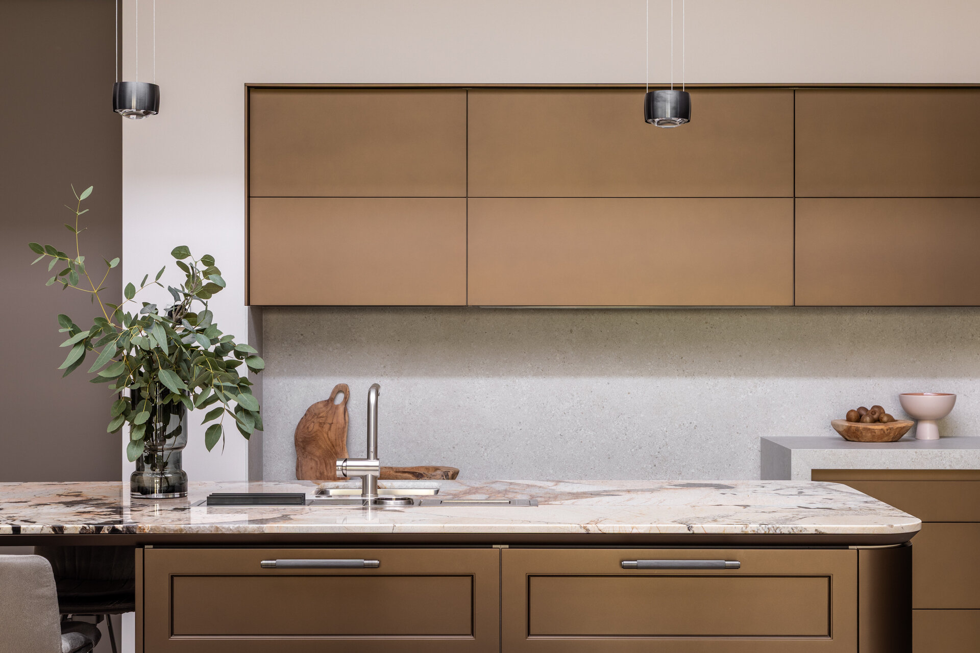 Ta kompozycja żyje wraz ze zmieniającym się światłem, rzucając na wnętrze szlachetne, metaliczne refleksy w odcieniu berylium bronze. Świetlistość frontów wchodzi w odważny mariaż z surowym, ekspresyjnym rysunkiem kamienia, tworząc scenografię dla codziennych rytuałów.